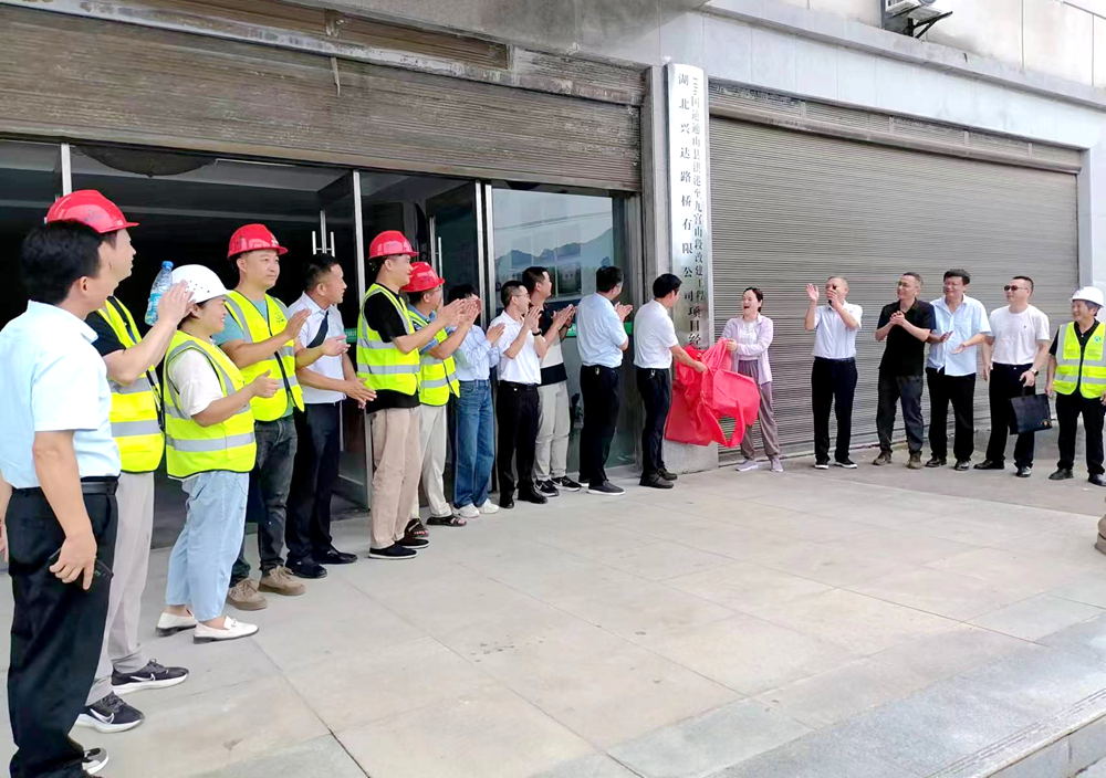 调研结束后,调研组一行出席项目部揭牌仪式。通山县委常委、副县长徐丽华与兴达公司党委书记、董事长沈前进共同为“湖北兴达路桥有限公司G106国道通山县洪港至九宫山段改建工程项目经理部”揭牌。
